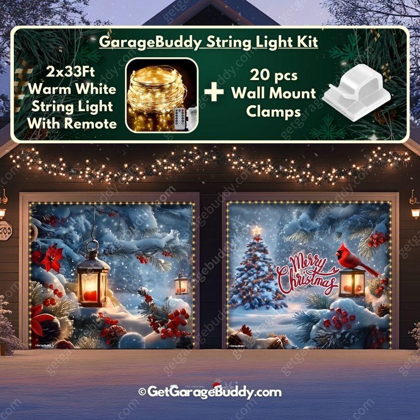 Transform your garage with this enchanting winter scene—a snowy Christmas tree and a charming cardinal resting on a lantern—bringing a melody of holiday spirit to your home.