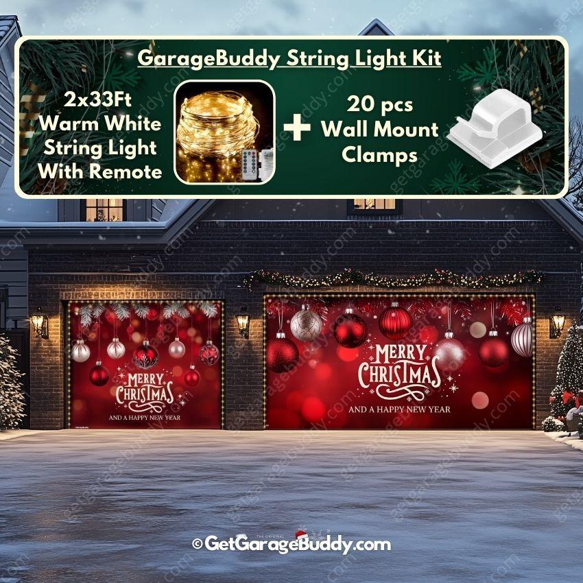 You now have the option to add the Garagebuddy string light kit to your order at 50% Off and turn your garage into a true winter wonderland. The kit includes 1x 33ft warm white string light. a remote control. and 10x sticky wall mount clamps. The 2-door garage option comes with 2 string light kits. The lights work on three AA batteries (not included). so you don't need to run around finding electrical outlets.