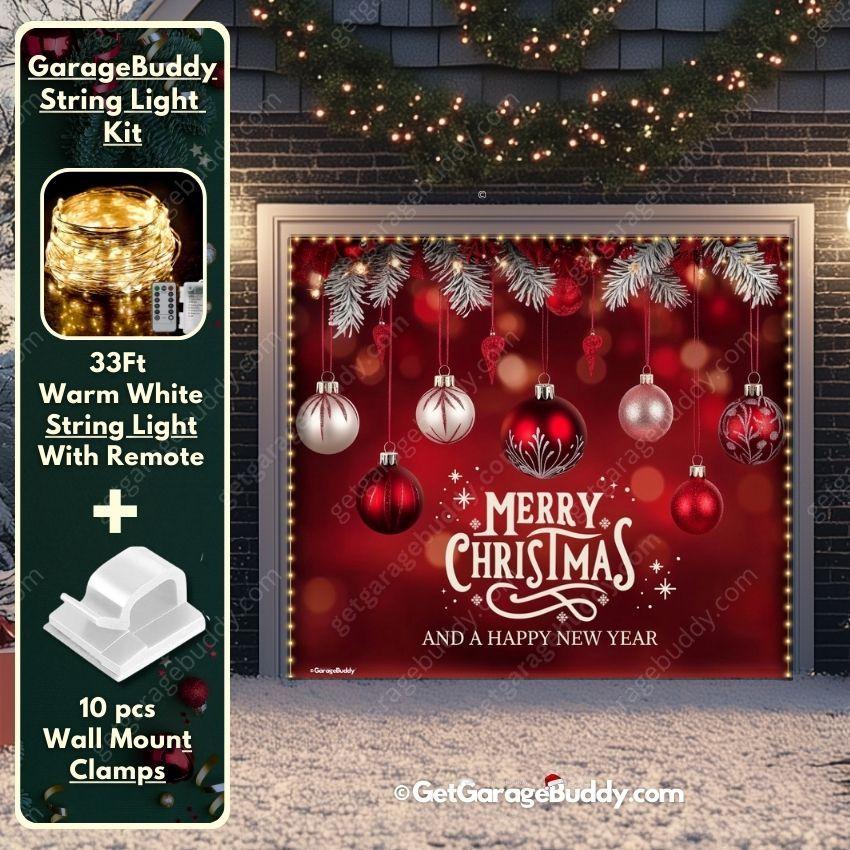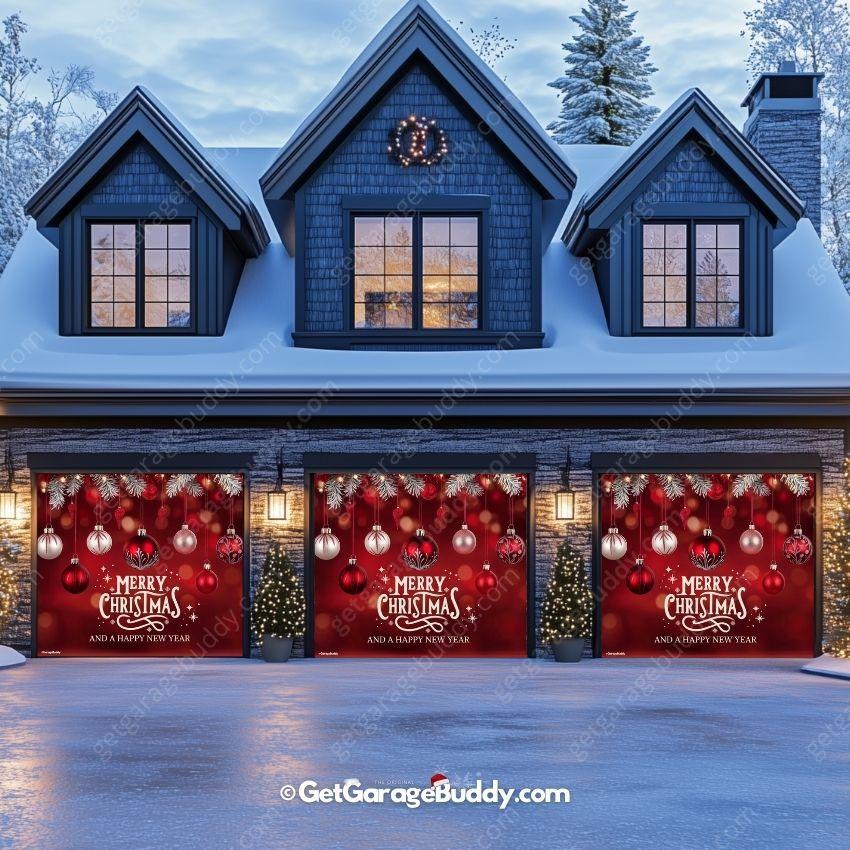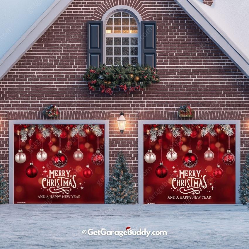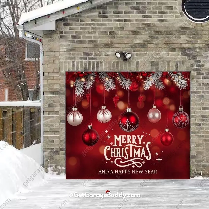 Bring a pop of festive color to your home with our striking garage door cover showcasing red ornaments on a cheerful Christmas-red background. The elegant Merry Christmas and Happy New Year greeting adds a touch of warmth. making your garage a beautiful focal point for spreading holiday cheer throughout the neighborhood.
