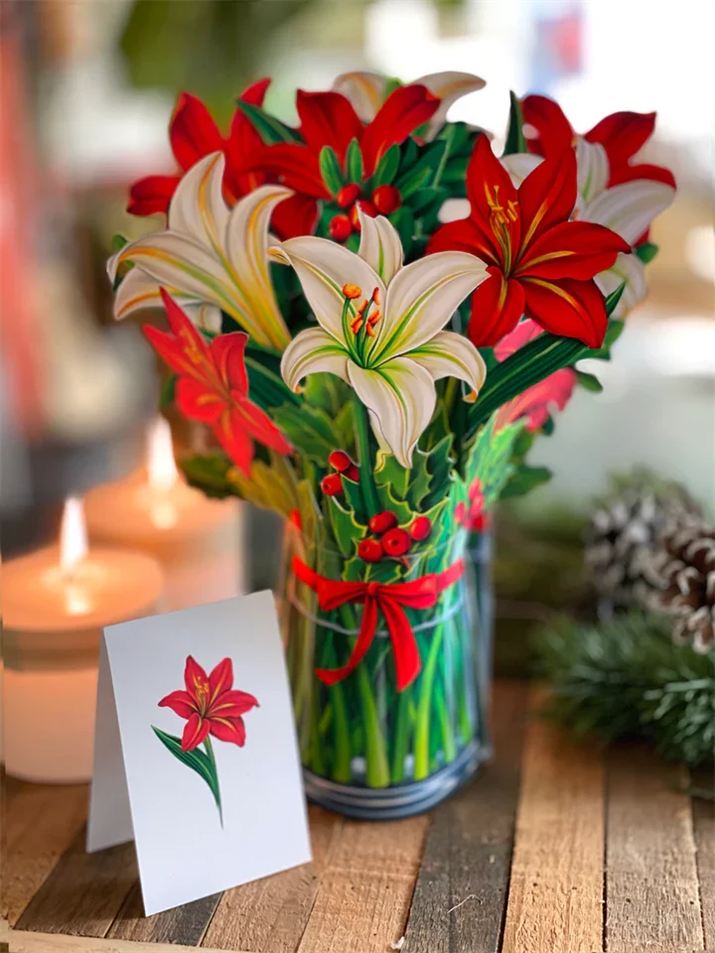 English Daffodils:A pop up bouquet Daffodils is a delightful greeting card celebration of uplifting emotions and support. Daffodils are a hardy springtime flower that traditionally symbolize resilience and success. The bright blossoms of this arrangement will outlast normal cut flowers and continue to thrive without any need for water or preservatives. Easy to care for and long-lasting, these flowers will continue to cheer on your special someone for many years to come.