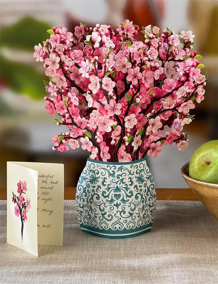 Cherry Blossom:Meet FreshCut Paper's Cherry Blossom bouquet: Elegant, chic, and timeless! Native to Japan, the soft pink sakura petals represent renewal and the wondrous beauty of nature. Unlike in the wild, this charming display will remain in bloom year round accompanied with an ornate paper vase.