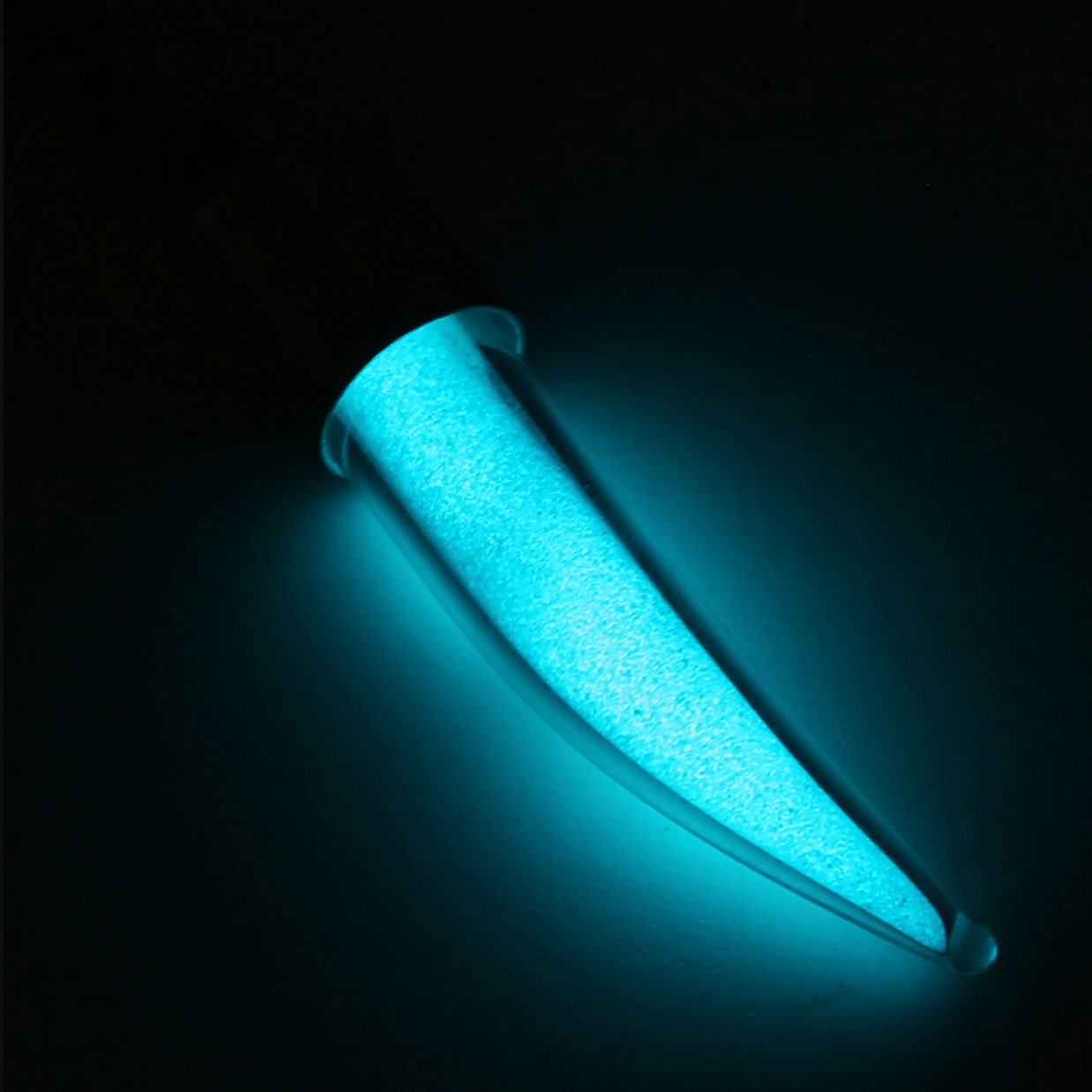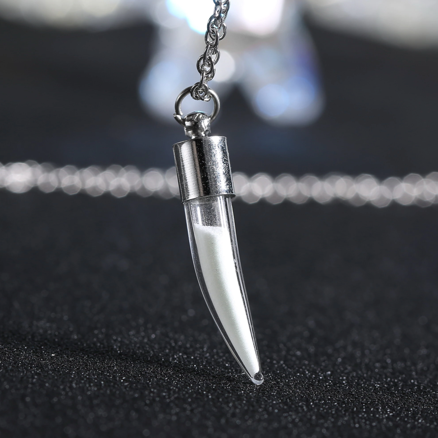 A beautiful unisex glow-sand saber tooth pendant containing crystal powder that stays white by daylight, but glows under the cover of darkness