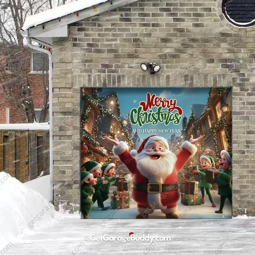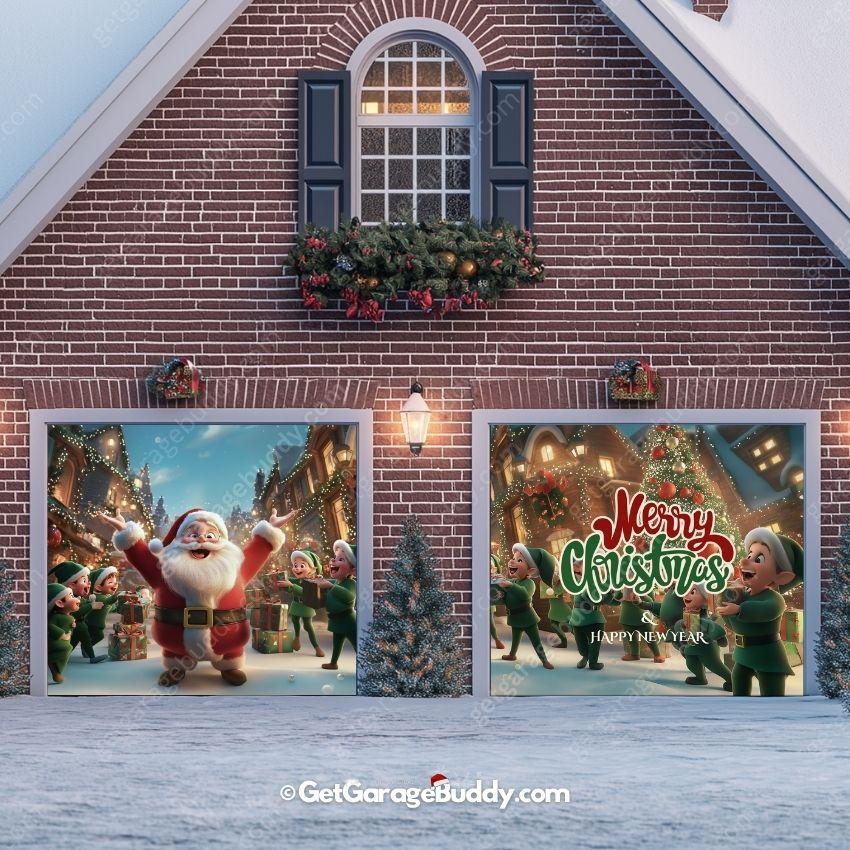 Bring the excitement of the North Pole to your home with this charming design showing Santa happily surrounded by his hard-working elves. This festive garage door cover is perfect for adding a touch of Christmas magic and turning your home into a holiday wonderland.
