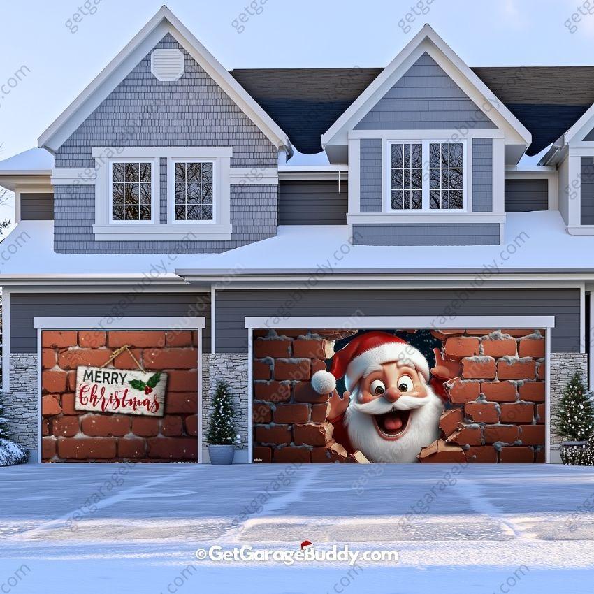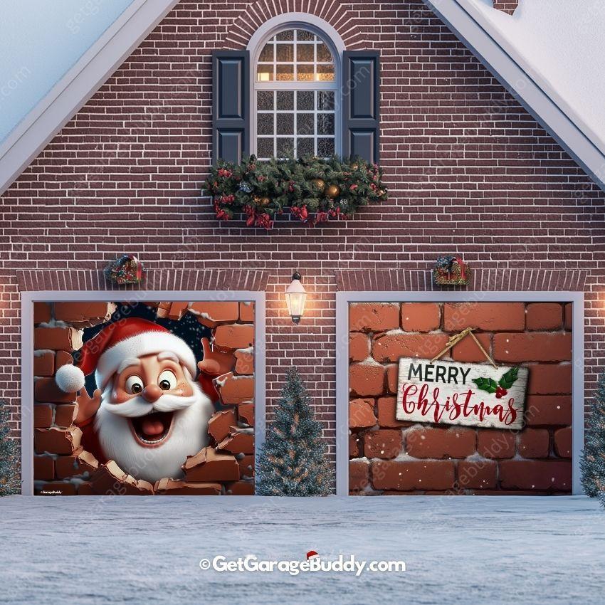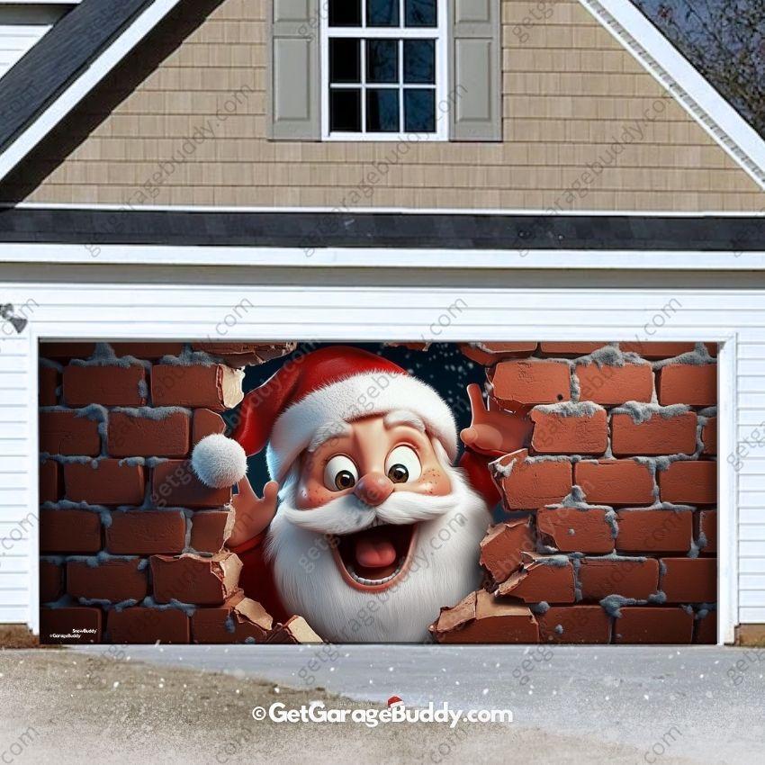 Smash Into The Festive Season With Santa's Big Entrance.His jolly face pops out of the hole. ready to surprise everyone who passes by. This garage door cover is the perfect way to add excitement and humor to your Christmas celebrations!.